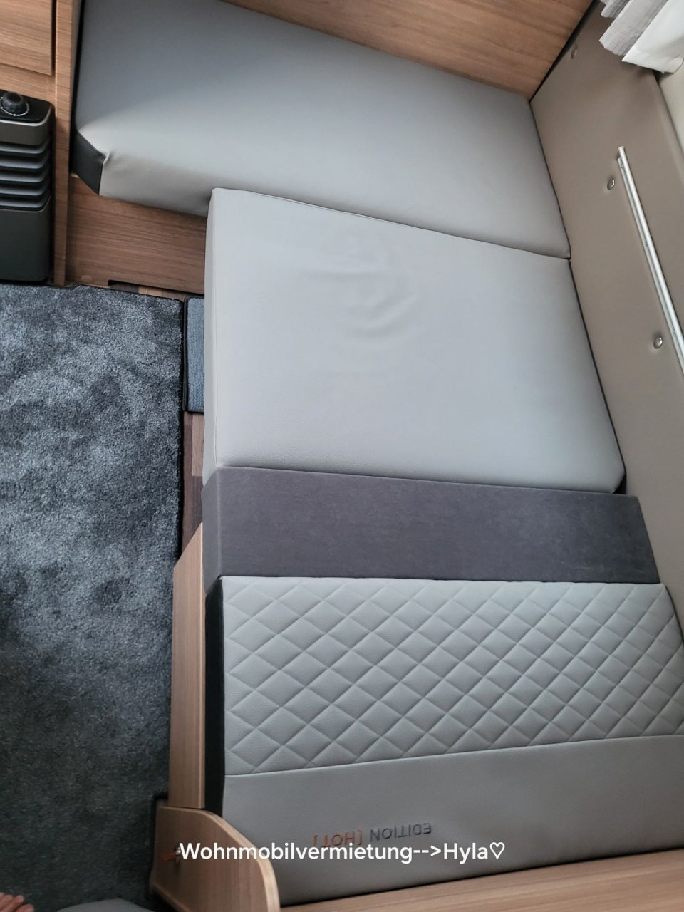 Er bietet 2 feste Schlafplätze (1,96cm x 1,40cm), mit einem Umbau von der Sitzgruppe (1,81cm x 1,17cm) findet auch eine dritte Person oder 2 Kinder Ihren Platz.