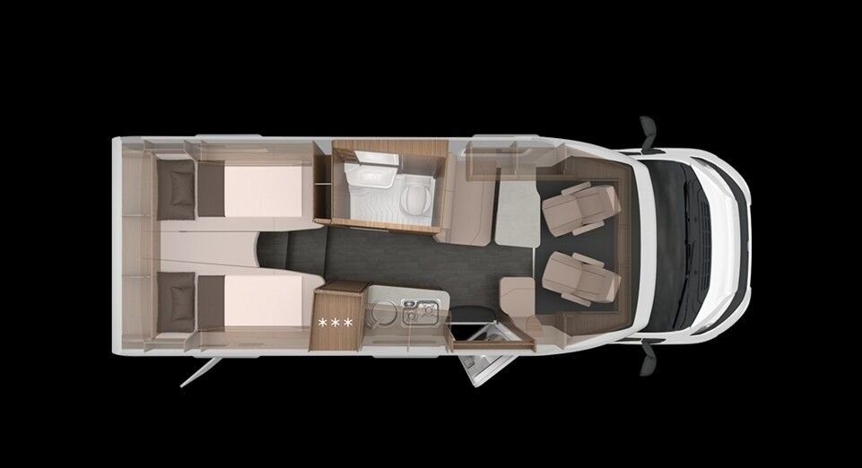 Er bietet 2 feste Schlafplätze ohne das etwas umgebaut werden muss. Mit einem kleinem Umbau kann man aber mit 3 Personen darin schlafen. Er hat auch 4 Sicherheitsgurte.